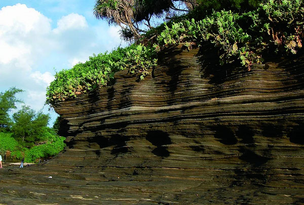 顺着间歇风送来的海浪声音,我知道自己没走错,往东,再往东,就看见芝麻滩了,这是一片望不见边的沙滩,并不是大,而是有优美的弧度,在眼睛能看见的范围里,突然拐了个弯,就奇妙的消失了。海浪顺势一层层的叠过来,在沙滩上化成一滩白沫,浮起一些彩色的贝壳,里面藏着小小的、透明的寄居蟹。我一直在奇怪“芝麻滩”这个名字的含义,到了这里才发现,由于火山爆发,山体被震动,许多碎石从上方滚下至沙滩,散落一地的碎石,远距离看就好像一地的芝麻,星星点点洒在海边。来之前,听说岛上的无人海滩有很多,但像芝麻滩这样“一地芝麻”的却只有这一处,芝麻滩的“滩”也并不是一般意义上的沙石滩,而是由火山岩浆流淌至此,然后凝固形成的地面。由于海滩是坚硬的凝固层,除了让人想象出岩浆流动时惊心动魄的美,几乎别无它用。船无法停泊,靠岸更是别想,失去了贸易的可能,于是这个小港就被彻底放弃了,终于成了只有探险者才会前来探望的地方。